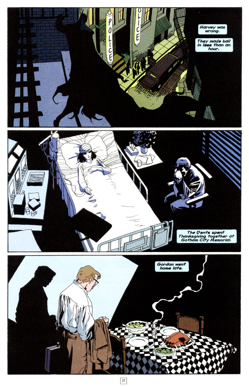 Igualmente, la caracterización de Jim Gordon y los mafiosos es muy escasa (las motivaciones de Maroni en particular son inconsistentes). Sí resulta refrescante la versión que Loeb y Sale nos ofrecen de Catwoman como una villana más juguetona y descarada de lo usual, pero incluso en su caso las motivaciones están mal trabajadas. Batman le pregunta varias veces por qué actúa como lo hace o de qué bando está y ella se limita a responder invariablemente con alguna frase ambigua.